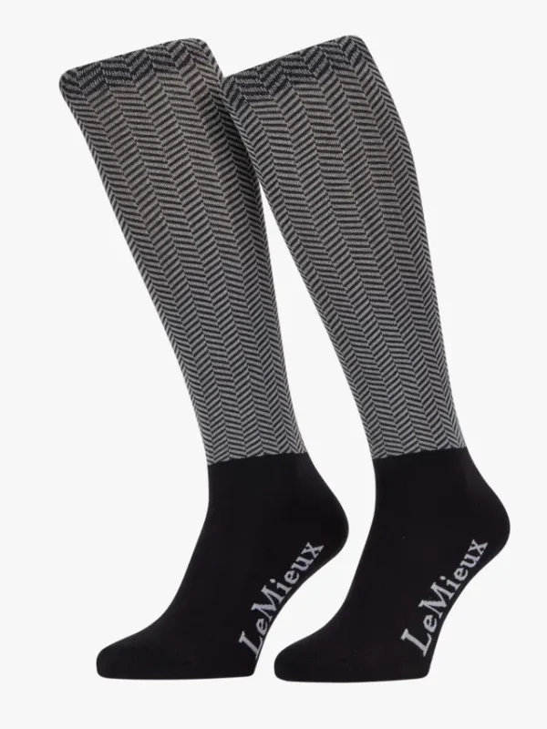 Ze passen bij de hele Aspen-collectie en zijn afgewerkt met een jacquard gebreide visgraat-bovenzijde om over een legging of rijbroek te dragen. Deze hoge sokken hebben een naadloze voet om onder laarzen en schoenen te dragen.