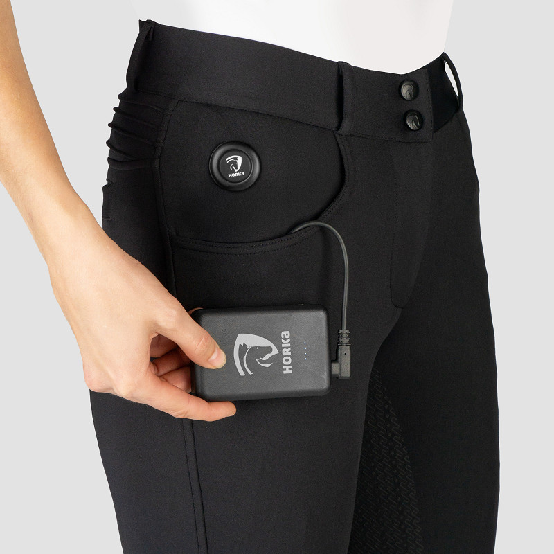Verwarmde rijbroek met volledig siliconen zitvlak. Met de aan/uit-knop worden drie verwarmingselementen verwarmt: twee op de rechter- en linker bovenbenen, één op de onderrug. Dit product voldoet aan de geldende EU-richtlijnen en het draagt het CE-keurmerk.